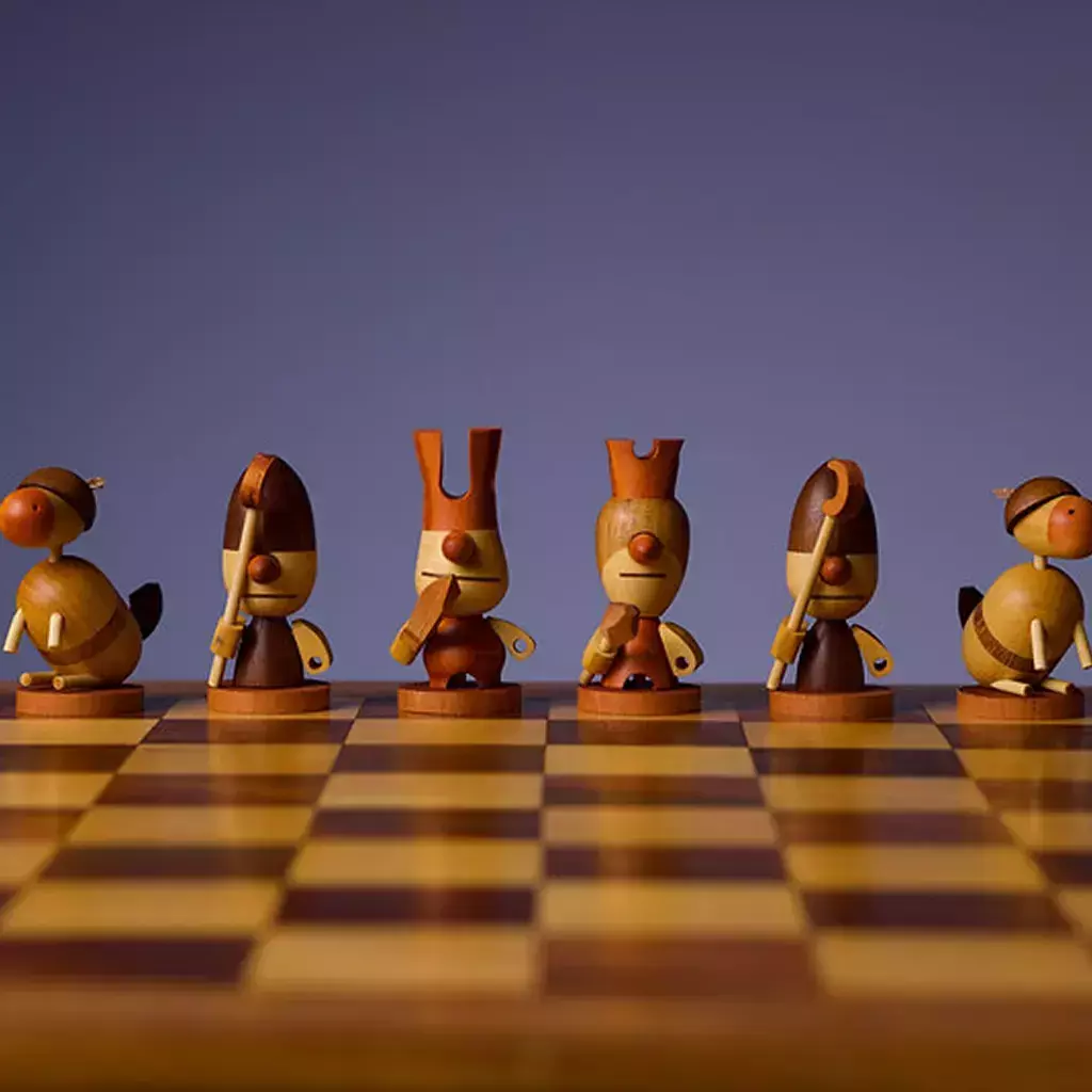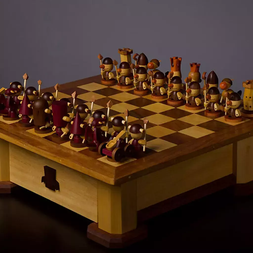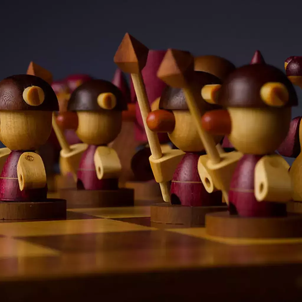 Invocando o design autoral da linha Defensores, “A Batalha” é um conjunto de xadrez feito inteiramente à mão. Trabalhamos 10 espécies de madeiras maciças brasileiras. É a nossa peça mais complexa: são cerca de 550 pecinhas que formam o tabuleiro com gavetas e suas 36 figuras.